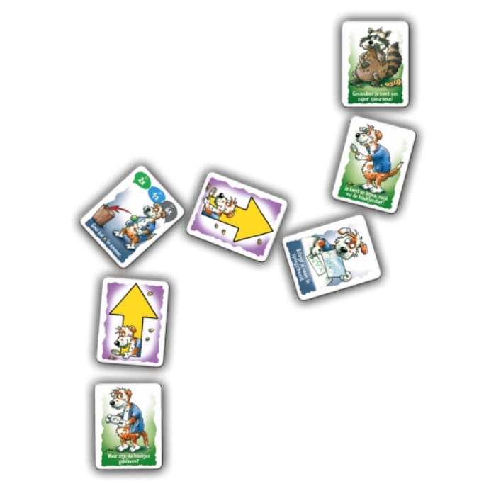 Het kaartspel bestaat uit 40 dubbelzijdige kaarten die je in een route uitzet. Aan de ene zijde staat een pijl die de looprichting aangeeft, aan de andere kant staat een speelse opdracht. Denk aan hinkelen, dieren nadoen, raadsels oplossen of creatieve bewegingen uitvoeren. Door deze structuur ontstaat een unieke mix van speurtocht en bewegingsspel, afgestemd op elke situatie.