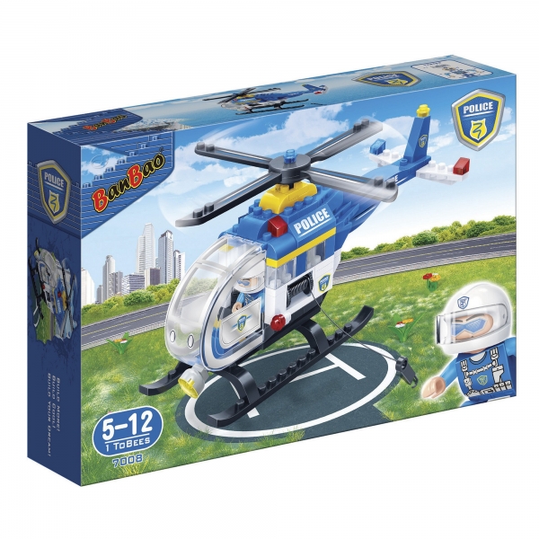 Bouw en speel met 7008 BANBAO Politie Helikopter! Vlieg hoog, speur rond en beleef spannende missies vol lef en avontuur.