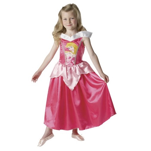 De jurk is uitgevoerd in prachtige tinten roze met glanzende accenten en een subtiele glitterprint op de rok. Het lijfje is versierd met een afbeelding van Aurora en een glinsterende ‘juweel’-broche bij de halslijn. De mouwen hebben een lichte pofvorm, afgewerkt met satijnachtig materiaal. Elk detail is met zorg uitgewerkt, zodat de jurk niet alleen mooi oogt, maar ook aanvoelt als iets bijzonders.