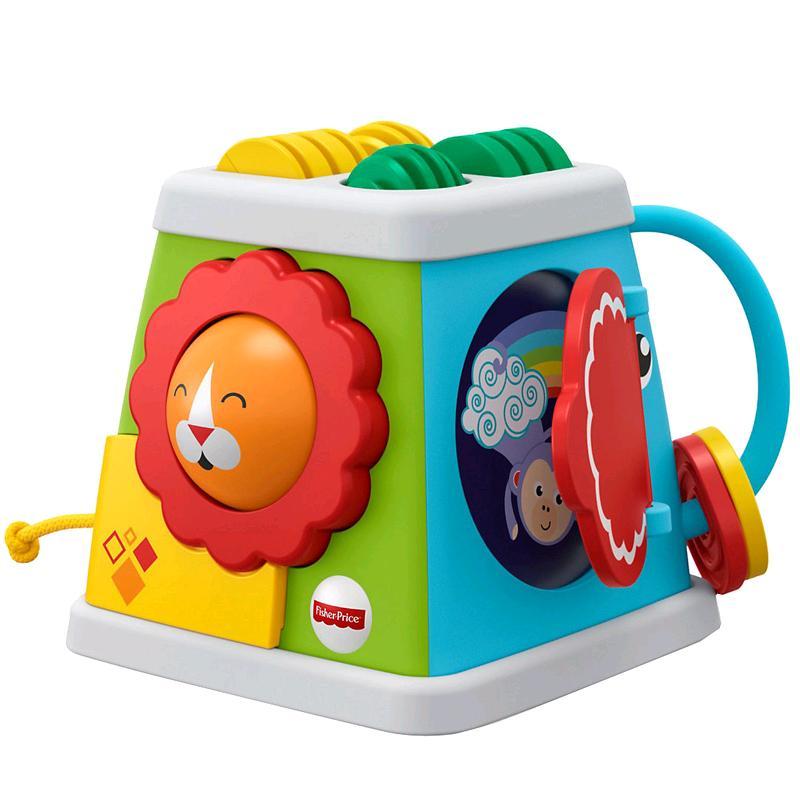 De Fisher-Price Pak en Draai Activiteitenkubus biedt een speelse ontdekkingsreis in een handig formaat. Op elke zijde van de kubus wacht een nieuwe verrassing: van een vrolijk draaiende leeuw tot kleurrijke rammelende kralen en een klikkende kikker die op en neer springt. De kubus is ontworpen om de nieuwsgierigheid van je baby continu te prikkelen. Door de combinatie van beweging, geluid en kleur blijft elk speelmoment boeiend en afwisselend, telkens weer anders.