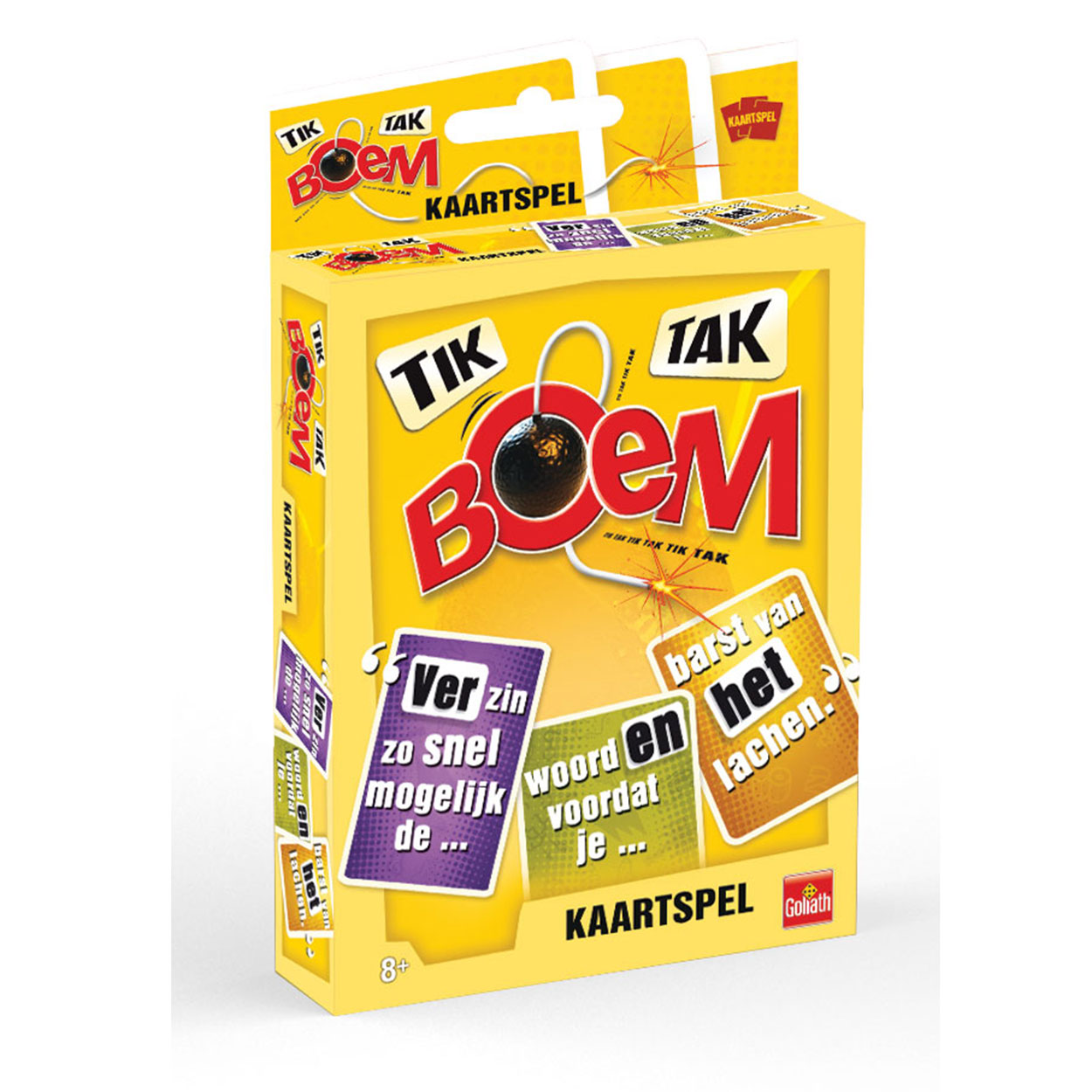 Tik Tak Boem kaartspel van Goliath. Neem een kaart van de stapel. Voer de opdracht uit en maak woorden met de lettergroepen die je krijgt.