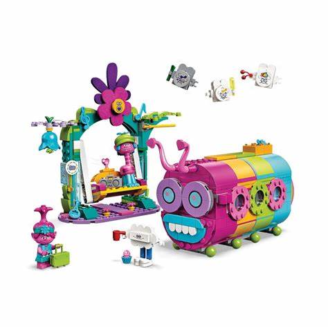 De Regenboogrupsbus is een voertuig zoals geen ander. Zijn vrolijke vorm beweegt als een rups, en de felle kleuren zorgen ervoor dat hij overal opvalt. Binnenin is er ruimte voor de Trolls om te dansen, te zingen of gewoon even te relaxen na een muzikaal optreden. Aan de zijkant vinden kinderen een draaischijf die de wielen laat bewegen, en bovenop schittert een discobal die het licht laat dansen over het interieur. Overal zijn kleine details te ontdekken, van instrumenten tot glinsterende accessoires. Terwijl kinderen bouwen, voelen ze de energie van het avontuur groeien met elke steen die ze plaatsen.