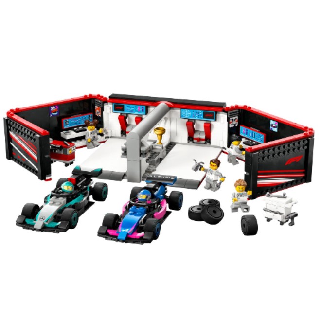 De garage gonst van bedrijvigheid terwijl het team zich klaarmaakt voor een nieuwe wedstrijd. De wielen worden verwisseld, de motor draait stationair en de computer meet elke prestatie. De monteur roept nog iets naar de coureur, en dan klinkt het signaal: tijd om te racen. Kinderen kunnen hun eigen scenario’s verzinnen: een testdag voor een nieuwe bolide, een noodreparatie vlak voor de start of een nachtelijke oefensessie. De accessoires, van gereedschapswagens tot brandstofvaten, maken het geheel compleet. Zo ontstaat een levendige wereld vol techniek, samenwerking en snelheid, waarin elk detail een rol speelt.