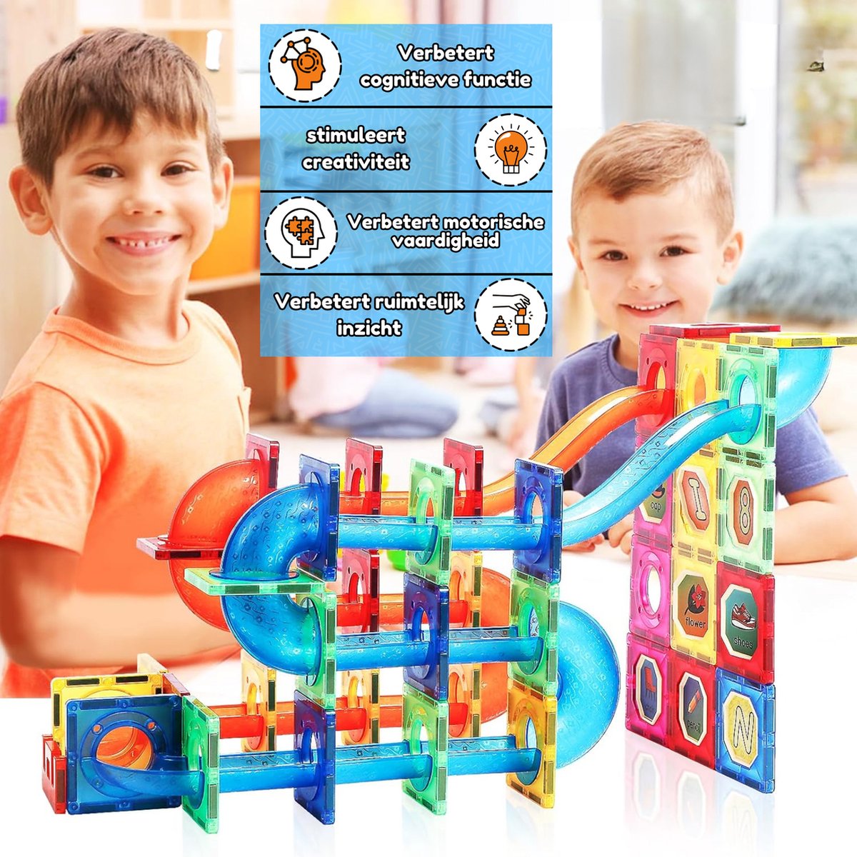 Deze set wordt geleverd met alles wat nodig is om direct aan de slag te gaan: meerdere knikkers, stevige magnetische tegels en verschillende soorten buizen. Transparante glijstukken laten zien hoe de knikkers door de baan bewegen, wat niet alleen leuk is om te bekijken, maar ook een leerzame ervaring biedt. Dankzij de variatie in onderdelen kunnen kinderen steeds weer nieuwe ideeën uitproberen, van snelle afdalingen tot spannende sprongen.