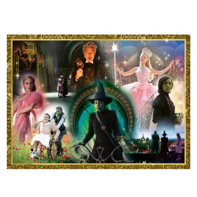 De afbeelding toont de iconische hoofdpersonages: Elphaba, de Groene Heks, en Glinda, de Goede. Achter hen schittert de smaragdgroene stad Oz, omlijst door fonkelende sterren en toneelachtige details die het gevoel van een voorstelling oproepen. De compositie is rijk aan kleurcontrasten en subtiele accenten, waardoor de puzzel boeiend blijft tot het allerlaatste stukje. De expressieve gezichten van de heksen en de symboliek in de achtergrond vertellen een verhaal dat net zo meeslepend is als de musical zelf. Hierdoor wordt elk moment aan tafel een kleine reis naar de wereld van Oz.